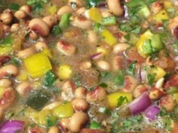 Lucky black-eyed peas, onions, garlic, peppers, Greek vinaigrette. Marinated and server cold!